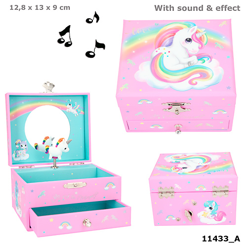 Szkatułka z pozytywką Jednorożec, po otwarciu szkatułki widać kręcącego się jednorożca i słychać melodyjkę.