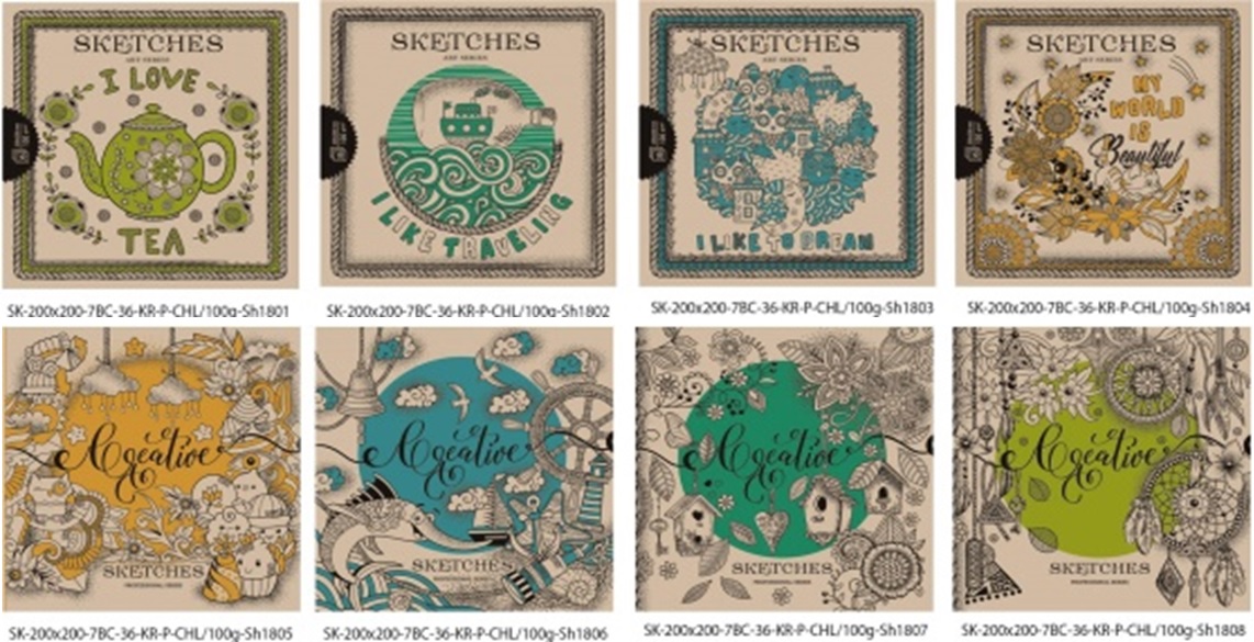 Szkicownik 200x200 36 stron 100g/m2 TW karton, mix wzorów, wzór wysyłany losowo.