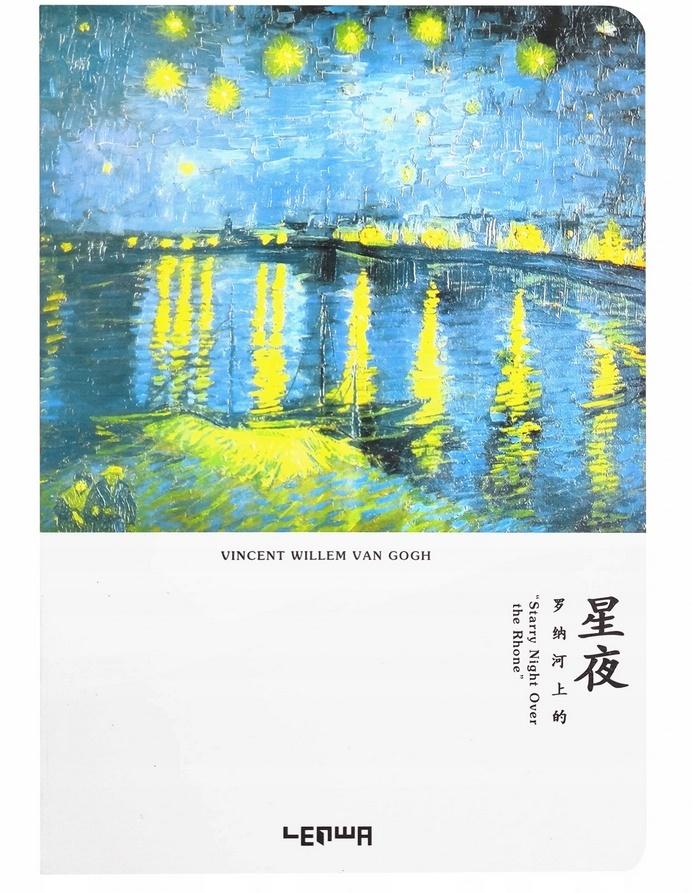 Szkicownik A5 w twardej oprawie z niebanalna okładką przedstawiającą reprodukcję obrazu Vincenta Van Gogha Gwiaździsta noc nad Rodanem . Posiada 100 gładkich, szytych kartek o gramaturze 100gsm, w tym również kartki craft o gramaturze 80 gsm. Umożliwia to wykonywanie szkiców węglem, ołówkiem i kredkami.