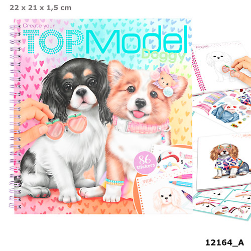 Szkicownik Doggy TOPModel, zawiera 82 strony: do projektowania strojów dla piesków i przykłady stylizacji oraz 3 strony naklejek.