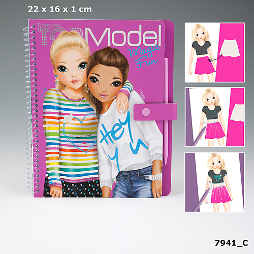 Szkicownik Magic Fun TOPModel zamykany na zatrzask, 30 kartek z sylwetkami,zawiera 4 strony samoprzylepnej folii z wyciętymi elementami garderoby, z której, przy pomocy dołączonego patyczka, można ścierać wierzchnią warstwę, tworząc trójwymiarowe efekty strojów. Wymiary: 22x16x1 cm