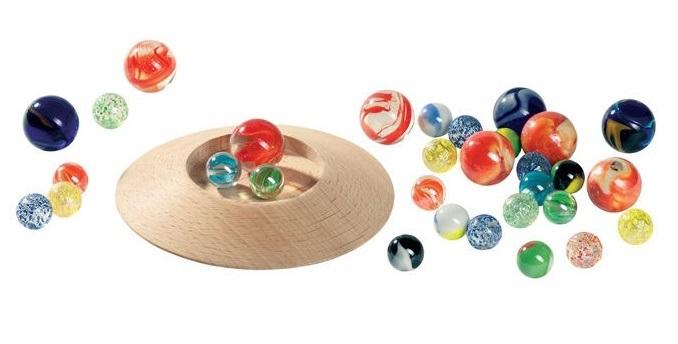 Zestaw 31 szklanych kulek + drewniany talerz idealny do każdej zabawy.