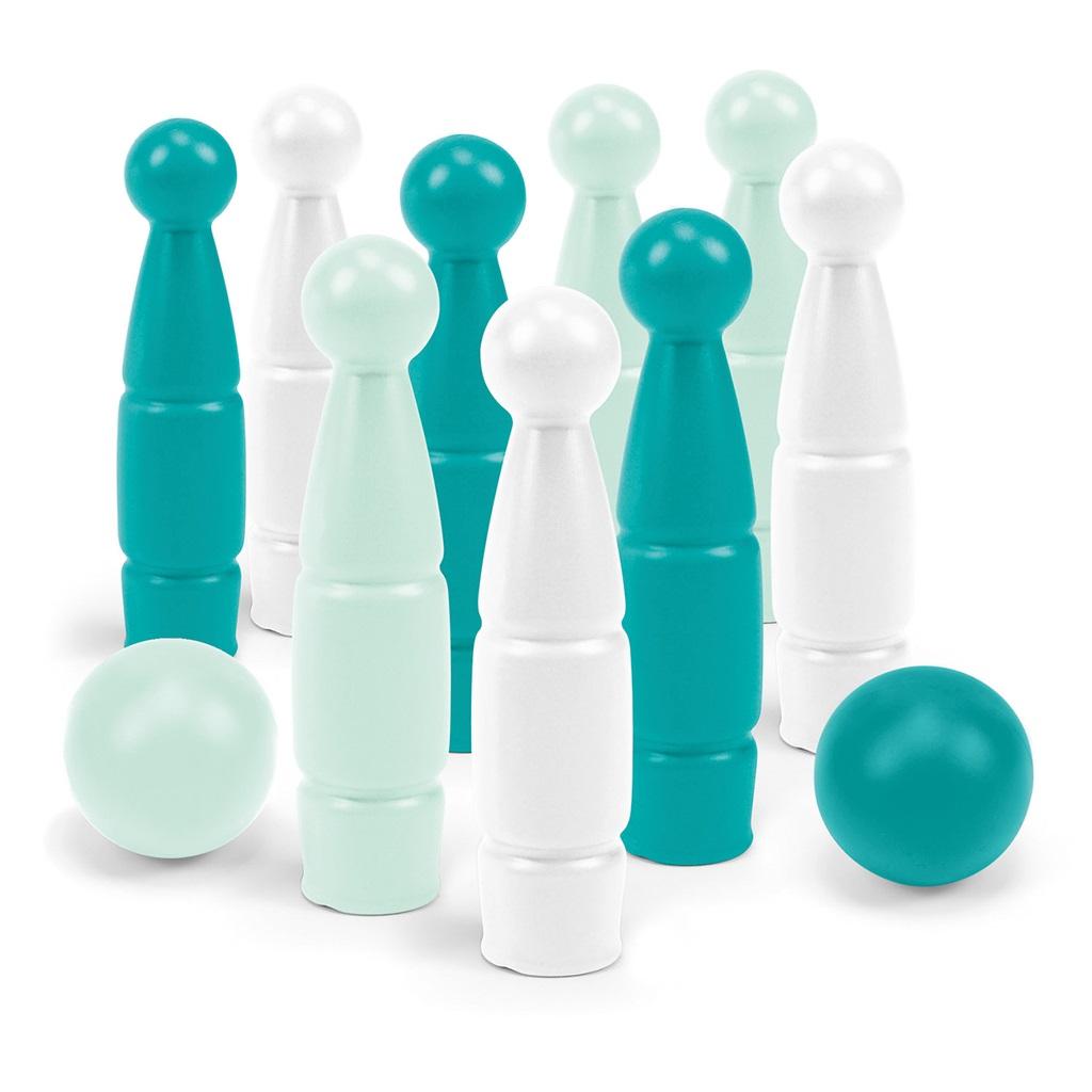 Zestaw do gry w kręgle w kolorze nasyconego turkusu, mlecznej mięty oraz bieli to fantastyczny sposób na wspólną zabawę. W zestawie znajduje się 9 różnokolorowych kręgli i 2 piłeczki. Całość jest starannie wykonana z bezpiecznych dla dzieci i trwałych materiałów. Gra w kręgle z serii Toys in Trends od Wader pobudzi wyobraźnię najmłodszych, rozwinie ich umiejętności motoryczne i manualne, precyzję ruchów, koordynację wzrokowo-ruchową i równowagę