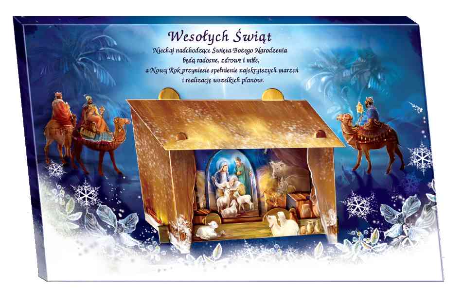 Przestrzenna szopka bożonarodzeniowa o wymiarach 6 x 22 x 15 cm. Doskonale wkomponuje się w dekoracje świąteczne każdego domu. Przedstawia Świętą Rodzinę w czasie narodzin Pana Jezusa oraz przybycie Trzech Króli. Gotowa do złożenia bez użycia kleju.