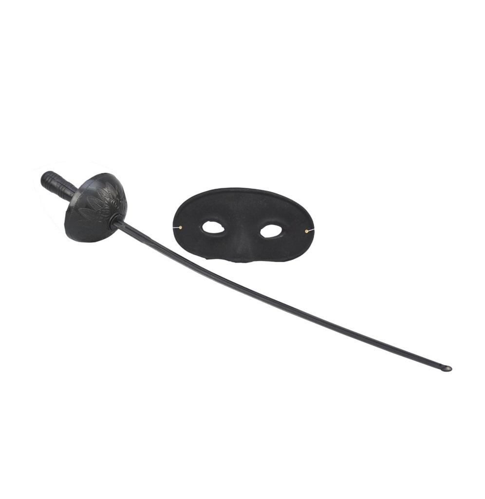 Elementy do uzupełnienia charakteryzacji Zorro. Szpada ok. 65 cm z zaokrągloną końcówką, maska o wymiarach: 19x9,5 cm z cienką gumką przytrzymującą.