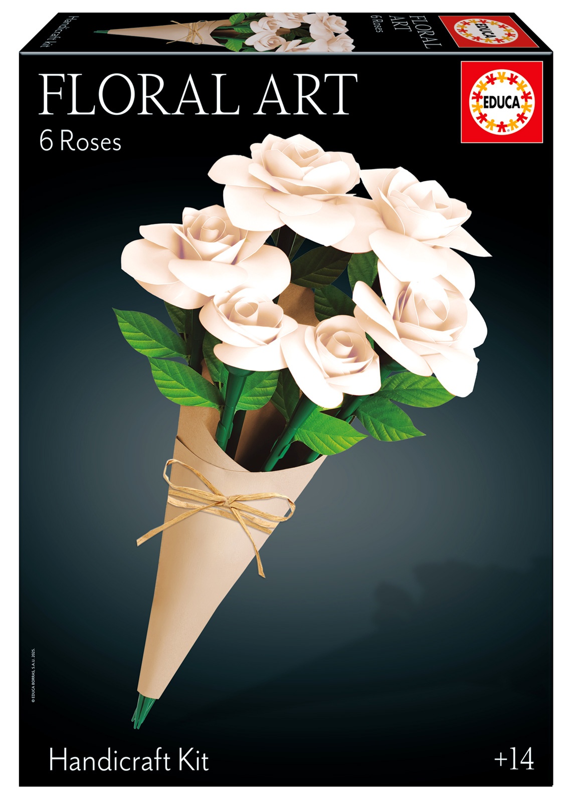 Pudełko zawiera wszystkie elementy niezbędne do stworzenia bukietu białych róż.