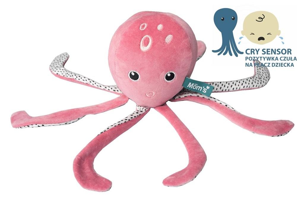 Do uszycia pierwszych przytulanek Twojego malucha używamy bezpiecznych tkanin o różnej strukturze. Dzięki temu dziecko poznaje świat i stymuluje zmysł dotyku. Nie zapominamy także o prawidłowym rozwoju zmysłu wzroku. Na samym początku nasze pociechy nie dostrzegają kolorów i nie odróżniają kształtów, dlatego powinniśmy wybierać zabawki, które przede wszystkim są bodźcami wzrokowymi. Dlatego też w mackach pojawia się biała bawełna z czarnymi kropkami, która jest widziana przez malca już w pierwszych dniach jego życia. Zabawka wyposażona jest w Cry Sensor, czujnik który reaguje na dźwięki i aktywuje zabawkę wtedy kiedy rozpozna płacz dziecka.
