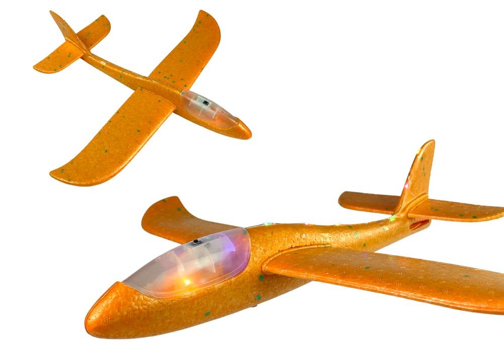 Duży Samolot Styropianowy Szybowiec Pomarańczowy Gratka dla młodych fanów lotnictwa. Każdy maluch marzy, by być pilotem samolotu, te podniebne maszyny budzą podziw i zachwycają każdego małego odkrywce świata. Szybowiec zachęci do zabawy na świeżym powietrzu. Kształt i niewielka waga pozwolą na dalekie loty i wykonywanie różnych akrobacji. Kolejną zaletą są kolorowe diody, które świecą w kabinie pilota i na całym grzbiecie samolotu. Samolot będzie widoczny nawet wieczorem. Cały ma kolor pomarańczowy kolor z zielonymi kropkami, a materiał, z którego jest wykonany jest wytrzymały na zgięcia i uderzenia. Wykonana jest z atestowanego materiału, czyli styropianu, co w połączeniu z wykonaniem z dbałością tworzy go lekkiego i gwarantuje bezpieczeństwo zabawy. Super rozrywka dla fanów aktywnej zabawy! Wymiary samolotu: 47 cm x 49 cm x 7 cm Wymiary opakowania: 54 cm x 15 cm x 8 cm Samolot posiada certyfikat CE, gwarantujący spełnienie wymogów Unii Europejskiej. Wymiary zabawki dostosowane są do rączek małych dzieci, co ułatwia chwytanie i zabawę. Przeznaczony jest dla wszystkich dzieciaków powyżej 3. roku życia. Zasilane trzema bateriami AG13, w zestawie.