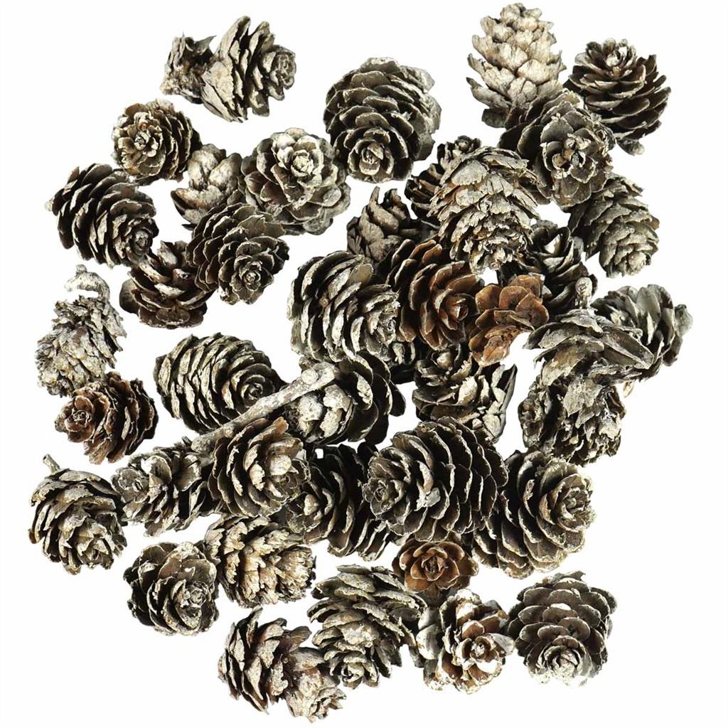 Naturalne szyszki modrzewiowe farbowane, sprawiające wrażenie ośnieżonych. Element dekoracyjny idealny do tworzenia stroików, wieńców, dekoracji jesiennych i świątecznych. Szyszki o wielkości około 2 cm. W opakowaniu znajduje się 65 g produktu.