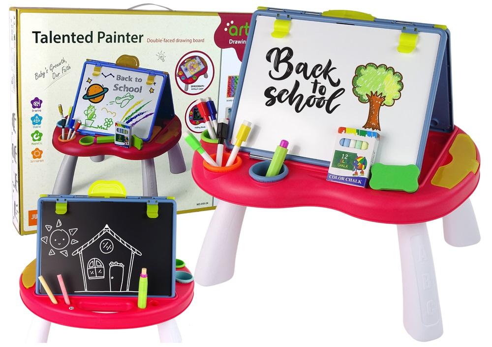 Tablica 2w1 Stolik Kredowa Pisaki Gra Chińczyk Węże Wiele możliwości w jednej zabawce! Mały artysta będzie mógł tworzyć własne obrazki, rozwijać zdolności artystyczne oraz dobrze się bawić! Nasz produkt rozwinie Twoje dziecko na różnych płaszczyznach i będzie dobrą pomocą do nauki i do spędzania wolnego czasu. U najmłodszych pomoże polepszyć zdolności manualne, wyobraźnie oraz kreatywność. Zabawie nigdy nie ma końca. Tablica posiada dwie powierzchnie do rysowania - białą, przeznaczoną do używania zmazywalnych pisaków oraz czarną, na której rysować kredą. Stolik pod spodem służy do przechowywania akcesoriów, okrągłe otwory będą idealne dla pisaków i kred. Drugim jego zastosowaniem jest powierzchnia do gier, w zestawie znajdują się dwie plansze węże i chińczyk, wraz z rówieśnikami może rozpocząć małą rywalizacje i nauczyć się zasad gry. Dla każdego malucha będzie to idealne urozmaicenie spędzania wolnego czasu oraz super nauka przez zabawę. Konstrukcja jest w pełni bezpieczna dla dzieci, stabilna i pozbawiona niebezpiecznych elementów. Wykonana w całości z plastiku, co gwarantuje trwałość. W zestawie znajdują się: -tablica - stolik - pisaki z gumką - 5 szt. - gąbka do zmazywania - kolorowe kredy- 12 szt. - kolorowe pojemniki - plansze do gry - kostka do gry - 16 sztuk pionków Wymiary tablica: 47 cm x 40 cm x 48 cm Wymiary pudełka: 58 cm x 45 cm x 8 cm Zgodnie z zaleceniami producenta przeznaczona jest dla dzieci, które ukończyły 3. rok życia. Konstrukcja prezentowanej tablicy jest bardzo przemyślana. Posiada certyfikat CE, zapakowana jest w oryginalny karton. Wykorzystanie go podczas realizacji projektu w zauważalnym stopniu zwiększa bezpieczeństwo i komfort użytkowania przez kilkulatkę, a także trwałość i odporność zestawu na uszkodzenia.
