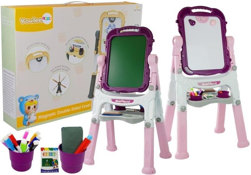 Tablica Dwustronna Magnetyczna - Kredowa Różowa Wielofunkcyjna tablica z możliwością rysowania kredą i pisakami sprawi radość każdemu malcowi, który uwielbia rysować. Rozwinie w nim zmysł plastyczny, wyobraźnie oraz funkcje ręki i dokładność. Jesteśmy przekonani, że różowa stojąca tablica pasuje do każdego pokoju dziecięcego! Rysowanie na tablicy bardzo pozytywnie wpłynie na rozwój dziecka. Multifunkcja taca z kubeczkami znajdująca się pod tablicą umożliwi twojemu dziecku przechowywanie kolorowych pisaków oraz innych akcesori zawsze pod ręką. Tablica posiada również możliwość obrotu o 360 stopni, dzięki czemu dziecko, w każdej chwili może obrócić ją na drugą stronę. Haczyk umiejscowiony nad tablicą pozwala również zaczepienie kartki papieru. W opakowaniu znajduję: - Zestaw 8 zmazywalnych pisaków- czerwony, granatowy, różowy, czarny, niebieski, fioletowy, zielony, żółty - Zestaw kolorowej kredy- 6 sztuk - dwa magnesy - Uchwyt do kredy - Gąbka do ścierania tablicy. Wymiary tablicy: około: 37,5 cm x 39 cm x 87 cm Wymiary powierzchni do pisania: 24,5 cm x 34,5 cm Wysokość od podłoża do tablicy: 57 cm Wymiary opakowania: 59 cm x 43,5 cm x 11,5 cm Przeznaczona dla dzieci powyżej 3 roku życia. Zgodna z normą EN71.