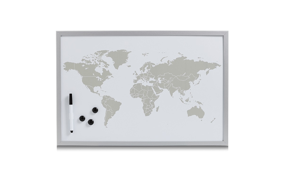 Praktyczna tablica magnetyczna z mapą świata w drewnianej ramie. Umożliwia pisanie notatek, zaznaczanie miejsc na mapie, przyczepianie fiszek za pomocą magnesów.