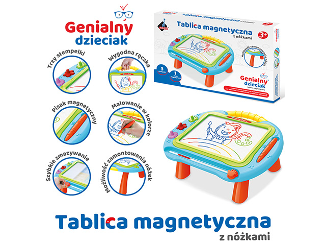 Zabawa w rysowanie na tablicy magnetycznej rozwija motorykę małej ręki oraz pobudza wyobraźnię malucha. Dodatkowo w zestawie 3 stempelki o różnych kształtach - kółko, gwiazdka i rączka.Pisak do rysowania jest lekki i dopasowany do małych rączek. Do tablicy można zamontować nóżki - z przodu krótsze, z tyłu dłuższe.Wiek: 3+