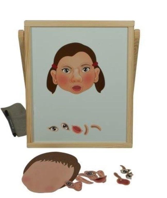Drewniana magnetyczna rozkładana tablica, z magnetyczną układanką - głowa chłopca i dziewczynki oraz elementy twarzy: oczy, uszy, usta, nos itp. Zestaw zawiera marker