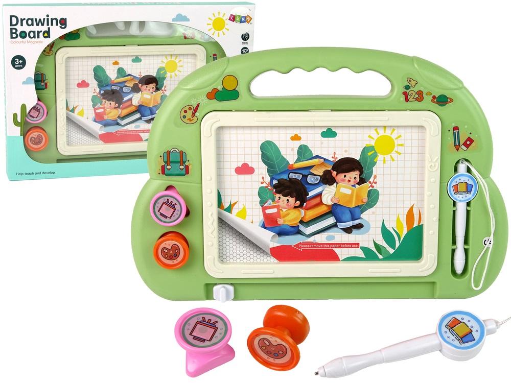 Tablica Magnetyczna Znikopis Pieczątki Zielona Tablica znikopis to ponadczasowa zabawka, idealna do rysowania oraz jako pomoc naukowa. Służy do pisania i rysowania znikających obrazków niezliczoną ilość razy ! Znikopis jest także świetną formą zarówno zabawy, jak i pomocą rozwijającą umiejętności manualna i plastyczne dziecka. Jak działa magiczna tablica magnetyczna? To bardzo prosta zabawka edukacyjna. Pod powierzchnią ekranu umieszczone są opiłki żelaza, które w trakcie rysowania specjalnym rysikiem układają się w stworzony przez dziecko wzór. Rysunki mogą być wykonane dowolną ilość razy - by zmazać obrazek, wystarczy tylko delikatnie przesunąć suwak umieszczony w dolnej części przedmiotu. By magnetyczny znikopis mógł służyć dziecku przez długi czas, należy korzystać z niego tylko za pomocą dołączonego do zestawu magnetycznego rysika. Pod żadnym względem nie wolno używać na ekranie klasycznych długopisów, pisaków bądź piór atramentowych. Tablica ma jeszcze dodatki takie jak dwie małe pieczątki w kształcie trójkąta i kwadrata. Przyda się przy nauce matematyki. Zestaw wykonany w kolorze zielonym, a dodatkową zaletą jest rączka do trzymania tablicy. Możesz ją zabrać wszędzie ze sobą. Wymiary znikopisu: 35 cm x 25 cm x 4 cm Wymiary ekranu: 19 cm x 13 cm Wymiary opakowania: 36 cm x 25 cm x 4 cm Zabawka przeznaczona dla dzieci powyżej 3 roku życia.