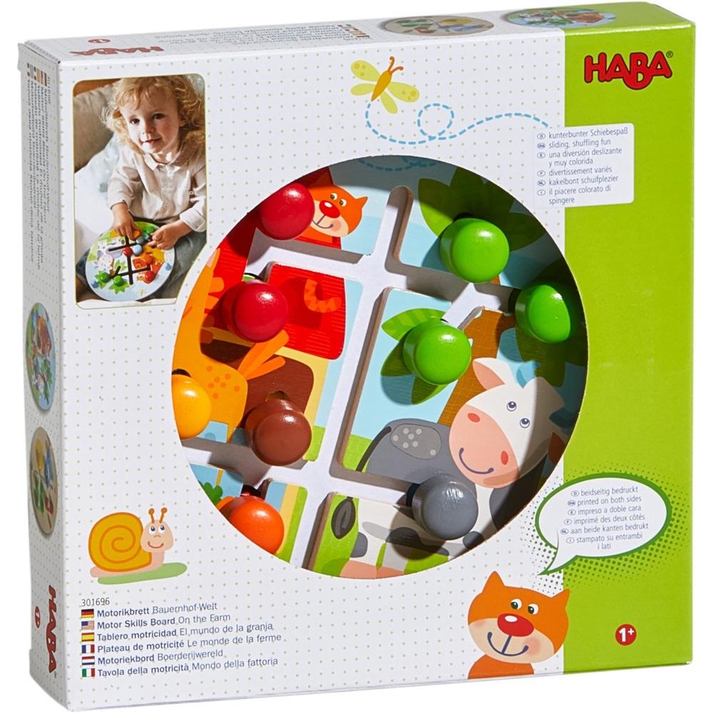 Za pomocą tablicy motorycznej Farma już małe dzieci uczą się dopasowywać kolory. Po odwróceniu zabawki na drugą stronę dzieci poznają figury geometryczne.