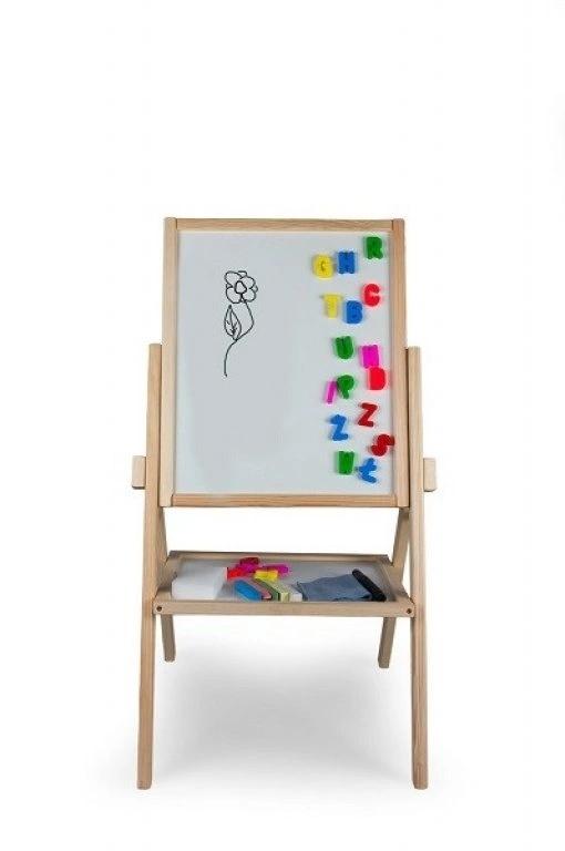 Obrotowa, suchościeralno-kredowo-magnetyczna naturalna tablica. Wyposażona w gąbkę i kredę. Tablica zawiera marker.