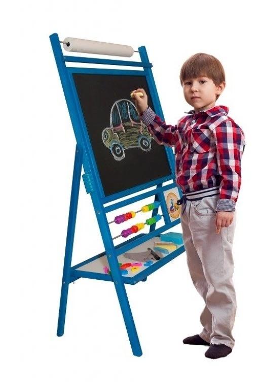 Obrotowa, Niebieska, suchościeralno-kredowo-magnetyczna tablica z 2-rzędowym liczydłem i ROLKĄ papieru do rysowania, zegar z motywem autka z ruchomymi wskazówkami. Wyposażona w gąbkę i kredę.Marker w zestawie.