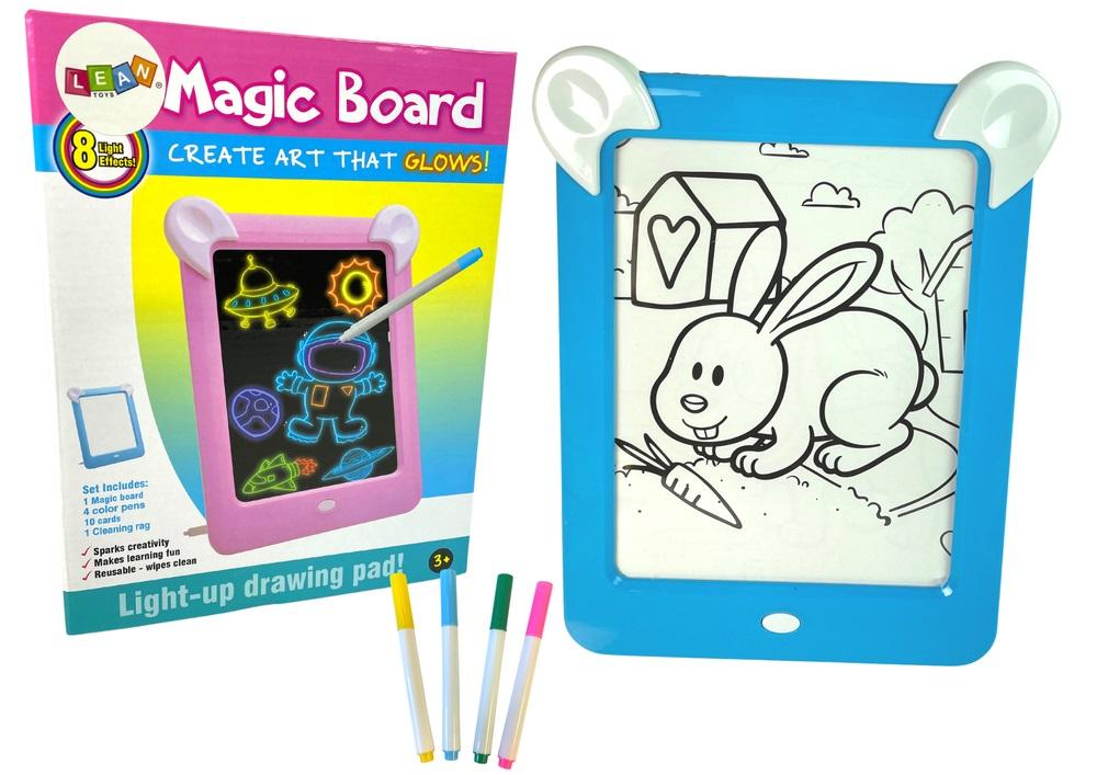 Magiczna Tablica Podświetlana Do Rysowania Szablony Markery Niebieska Tablica świecąca w ciemności to coś wyjątkowego! Przedstawiamy tablicę neonową w niebieskim kolorze, niesie ze sobą dużo zabawy i nauki. Nauka pisania nie będzie już straszna. Maluch poprzez zabawę rozwinie swoją precyzję, zdolności manualne oraz wyobraźnie Twórczości nie będzie końca! Jak rozpocząć zabawę? W zestawie znajdziesz szablony do pisania i rysowania. Wystarczy wybrać jeden z nich, włożyć do środka tablicy i rozpocząć odrysowywanie kształtów za pomocą pisaków dołączonych do zestawu. Po skończeniu należy wymienić podkładkę na czarną, nacisnąć przycisk, a rysunki będą świecić na wiele efektów świetlnych. Ta rozjaśniająca podkłada, da niesamowity efekt rysunkowi Twojego dziecka. Podświetlenie może dodatkowo wzmocnić atrakcyjność wykonanych rysunków i będą one świetnie prezentować w przyciemnionym pomieszczeniu. Kiedy skończysz, po prostu wyczyść ekran za pomocą szmatki, bądź ręcznika papierowego i zacznij od nowa. Świetna zabawa na wiele godzin! Ucz się, rysuj, maluj ! Główne cechy produktu: - Rozwija zdolności plastyczne - Wzmaga kreatywność - Idealny do użytku w domu jak i podróży Elementy zestawu: - świecąca tablica - 4 sztuki neonowych mazaków: niebieski, zielony, różowy, żółty - ściereczka do czyszczenia - 10 dwustronnych szablonów: kolorowanki Wymiary tablicy: 26 cm x 19 cm x 2 cm Wymiary opakowania: 27 cm x 21 cm x 3 cm Magiczna tablica zasilana jest trzema bateriami AAA (brak zestawie). Zabawka przeznaczona jest dla dzieci powyżej 3. roku życia. Zestaw posiada certyfikat CE i jest zgodny z normą EN 71. Zapakowany jest w kartonik, dzięki czemu nadaje się idealnie na prezent.