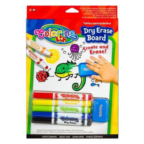Tablica posiada możliwość przywieszenia do ściany. Zestaw zawiera: - tablicę suchościeralną - zapasową wymienną powierzchnię do rysowania - 5 markerów - gąbkę