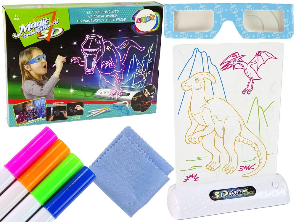 Magiczna Tablica do Malowania 3D Ta magiczna tablica do malowania 3D to niezwykły zestaw, który zapewni dziecku niekończącą się kreatywną zabawę. W zestawie znajduje się wszystko, czego potrzeba, aby stworzyć fascynujące i realistyczne obrazy. W zestawie znajduje się 6 obrazków z motywem dinozaurów, które stanowią doskonałą inspirację do twórczego malowania. Do dyspozycji są również 4 pisaki o różnych kolorach: różowy, granatowy, pomarańczowy i zielony, które umożliwiają precyzyjne i kolorowe rysowanie. Tablica jest przezroczysta, a dołączona ścierka do czyszczenia umożliwia łatwe usuwanie i tworzenie nowych obrazów. Dodatkowo, zestaw zawiera okulary papierowe i podstawkę z lampkami, które podświetlają umieszczoną na tablicy przezroczystą warstwę, tworząc niesamowity efekt trójwymiarowy. Ta magiczna tablica do malowania 3D rozwija wyobraźnię, kreatywność i umiejętności artystyczne dziecka. Jest to doskonały sposób na rozwijanie zdolności manualnych i odkrywanie wspaniałych światów. Zamów już dziś tę magiczną tablicę do malowania 3D i podaruj dziecku niezwykłą przygodę twórczej zabawy. To idealny prezent dla małych artystów i miłośników dinozaurów. Elementy zestawu: - 6 obrazków z motywem dinozaurów - 4 pisaki: różowy, granatowy, pomarańczowy i zielony - przezroczysta tablica - ścierka do czyszczenia tablicy - okulary papierowe - podstawka z efektem 3D ( do podświetlania gotowego obrazka) Wymiary tablicy: 16 cm x 12 cm Wymiary opakowania: 20,5 cm x 28 cm Produkt posiada certyfikat CE i jest zgodny z normą EN71. Zabawka jest przeznaczona dla dzieci powyżej 3. roku życia.