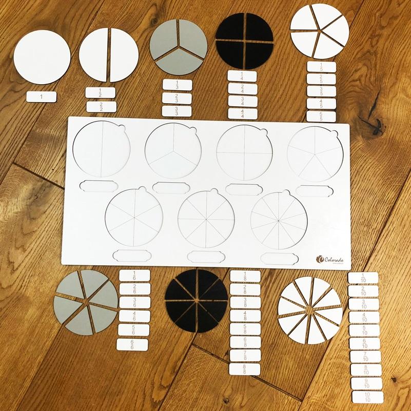 Tablica ułamkowa pozwala na naukę i utrwalanie ułamków zwykłych od drugich do dziesiątych części. Pomaga stymulować rozwój mózgu, kształtować logikę, ćwiczyć koncentrację i pamięć, a także umiejętności myślenia przyczynowo-skutkowego. Dzieci mogą dobierać części kół do podpisów, lub dopasowywać podpisy do wcześniej ułożonych elementów. Dzięki takim zabawom mają okazję również, aby poprawić chwytność palców.