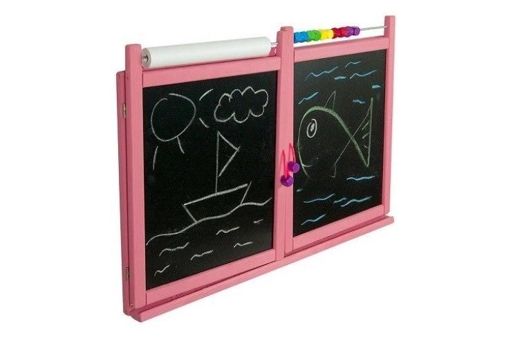 Wisząca dwustronna, zamykana, drewniana w kolorze różowym, tablica z podstawą pod kredę. Wyposażona w gąbkę oraz kredę. Zestaw zawiera marker suchościeralny. Zawieszki oraz wkręty do samodzielnego powieszenia dołączone do tablicy.