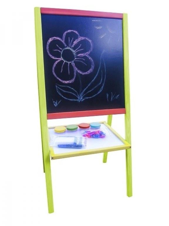 Kolorowa tablica magnetyczno-suchościeralno-kredowa dla małych artystów.Wyposażona dodatkowo w: 4 szt kubków na farbę, po stronie magnetycznej klips na kolorowanki, kredę, gąbkę, marker suchościeralny. Załączona pod klips kolorowanka gratis !!