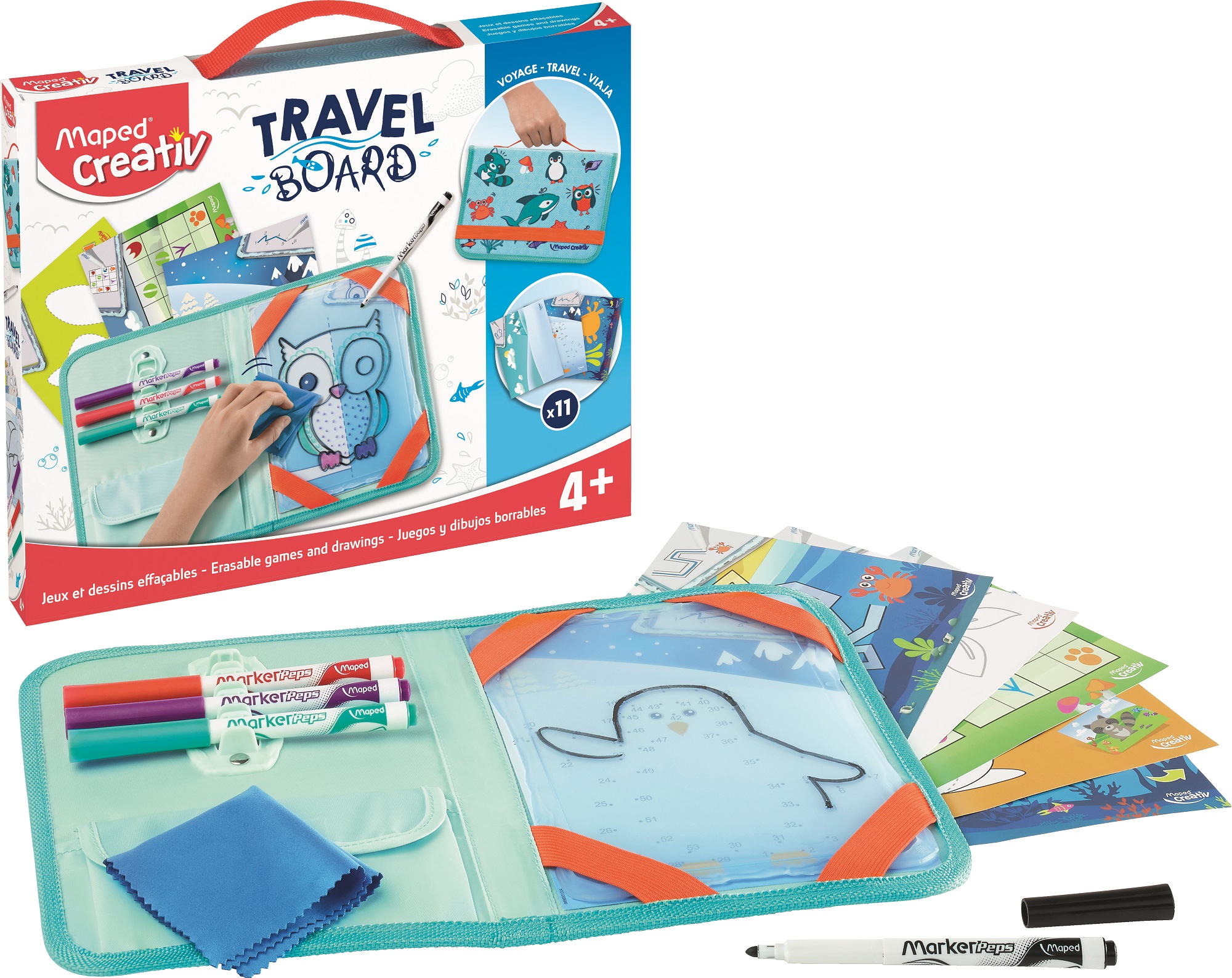 Zestaw kreatywny w materiałowej podróżnej teczce o wymiarach 23x29x3,3 cm. Zawiera przezroczystą tablicę, 4 markery w różnych kolorach, 11 obrazków do zabawy i ściereczkę do wycierania. Dla dzieci od 4 roku życia.