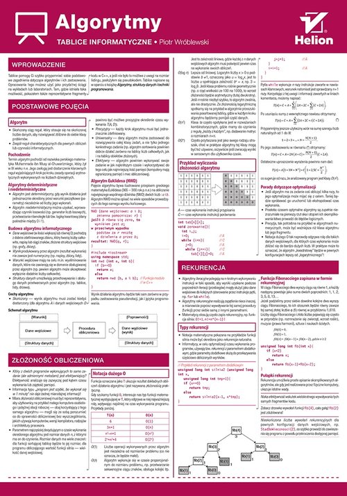 Cała wiedza w jednym miejscu! Nie pamiętasz jakiegoś algorytmu? Nie wiesz, jaką strukturę danych należy zastosować? Nie masz pojęcia, jak wyznaczyć złożoność obliczeniową algorytmu? Nie martw się, Twoje problemy należą już do przeszłości! Tablice informatyczne. Algorytmy pozwolą Ci szybko odnaleźć i przypomnieć sobie podstawowe zagadnienia dotyczące algorytmów i ich zastosowania. Będą doskonałą ściągą na wykładach lub laboratoriach, a nawet w pracy. Przykłady opracowane w C++ lub pseudokodzie pomogą właściwie zrozumieć i wdrożyć odpowiednie rozwiązania. Podstawowe pojęcia Złożoność obliczeniowa Algorytmy rekurencyjne Wyszukiwanie i sortowanie Typy i struktury danych Grafy i algorytmy grafowe Systemy liczbowe Kodowanie i kompresja Algorytmika nigdy nie była prostsza! Piotr Wróblewski — autor wielu książek z dziedziny informatyki. Z wydawnictwem Helion współpracuje od 1992 roku, czego wynikiem są liczne podręczniki dotyczące programowania i obsługi komputerów. Najpopularniejsze do tej pory ABC komputera i Algorytmy, struktury danych i techniki programowania doczekały się kilku wydań i cieszą się u Czytelników stałym zainteresowaniem. Ten ostatni tytuł ukazał się także za granicą. Piotr Wróblewski jest absolwentem Politechniki Śląskiej oraz francuskiej uczelni informatycznej ENSSAT (Lannion w Bretanii). Studia we Francji do tej pory wspomina jako największą przygodę swojego życia. Po powrocie do Polski zajmował się pisaniem oprogramowania na zamówienie i prowadzeniem szkoleń komputerowych. Przez kolejne dziewięć lat pracował w spółkach zagranicznych z branży IT/telekomunikacja, głównie w charakterze kierownika projektów (Impaq, Polkomtel). Już w trakcie pracy zawodowej ukończył dodatkowe studia z zarządzania i marketingu Master HEC w Szkole Biznesu Politechniki Warszawskiej. Od początku 2006 roku mieszka we Wrocławiu, gdzie pracuje w firmie Nokia na stanowisku kierownika produktu (obecnie w dziale oferującym rozwiązania telekomunikacyjne dla sektora bezpieczeństwa publicznego (tzw. Public Safety). Pełny profil zawodowy: https://www.linkedin.com/in/pwroblewski/.