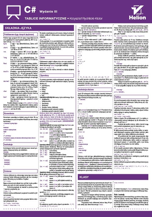 Najważniejsza wiedza jest tu! C# to obecnie jeden z najważniejszych, najpopularniejszych i najbardziej wszechstronnych obiektowych języków programowania, nic więc dziwnego, że na rynku dostępnych jest mnóstwo publikacji na jego temat. Niestety, są to przeważnie opasłe tomy, zupełnie nieprzydatne jako pomoc w codziennej pracy. Na szczęście są też Tablice informatyczne. C#, a ich nowe wydanie zawiera większość informacji, które zawsze należy mieć pod ręką! Skoncentrowana treść, zwarta forma, praktyczne przykłady kodu - tu szybko znajdziesz to, czego szukasz! Składnia języka Typy danych Klasy i dziedziczenie LINQ i komponenty WPF Połączenia HTTP Obsługa formatów danych XML i JSON Szukasz podpowiedzi? Sięgnij po tablice! O autorze Krzysztof Rychlicki-Kicior od 2003 roku działa w branży IT; ma doświadczenie w przeróżnych jej obszarach — od publicystyki (od 2005 roku współpracuje z wydawnictwem Helion jako autor książek i tłumacz), przez edukację (od 2013 roku prowadzi zajęcia na łódzkich uczelniach — na Politechnice Łódzkiej i w Wyższej Szkole Informatyki i Umiejętności, a od 2008 roku liczne szkolenia komercyjne z zakresy Javy i .NET), aż po działalność w software house Makimo, który współzakładał w 2010 roku i w którym na początku zajmował się programowaniem, później prowadzeniem projektów, a obecnie jest odpowiedzialny za tworzenie strategii sprzedażowej i analizę biznesową nowych projektów. Słowem, człowiek orkiestra — co nie jest określeniem przypadkowym, bo w 2017 roku obronił doktorat z cyfrowego przetwarzania sygnałów w zakresie analizy nagrań muzycznych.