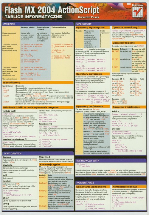 Podręczne kompendium wiedzy dla praktykówKoniec z wertowaniem książek i dokumentacji w poszukiwaniu składni poleceń, typów danych czy struktur języka. W tablicach informatycznych znajdziesz wszystkie podstawowe informacje, których potrzebujesz podczas codziennej pracy, podane w zwięzłej i treściwej postaci. Składnia poleceń, struktura programu, funkcje i metody, obiekty, typy danych -- jest tu wszystko, nad czym mógłbyś się zastanawiać.""Tablice informatyczne. Flash MX 2004. ActionScript"" to zbiór informacji o języku ActionScript. Przydatne dla siebie informacje znajdzie tu zarówno początkujący programista, jak i zaawansowany projektant rozbudowanych aplikacji Flash.Zmienne i typy danychOperatoryInstrukcje warunkowe i pętleKlasy i metodyDołączanie zewnętrznych plikówObiekty