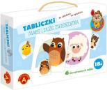 Tabliczki małe i duże zwierzątka to najprostszy rodzaj dwuelementowych puzzli. Zabawka skierowana jest do małych dzieci - powyżej 18 miesiąca życia. Każda tablica wykonana z grubej tektury zawiera wyjmowany element, który pasuje kształtem i wielkością do innych tablic. W trakcie zabawy dziecko wyjmuje i wkłada małe elementy w otwory tablic pasując je ze sobą lub różnicując ilustracjami. Zabawka motywuje do ćwiczeń spostrzegawczości, logicznego myślenia i zręczności manualnej. Dla dzieci w wieku od 18 miesięcy.