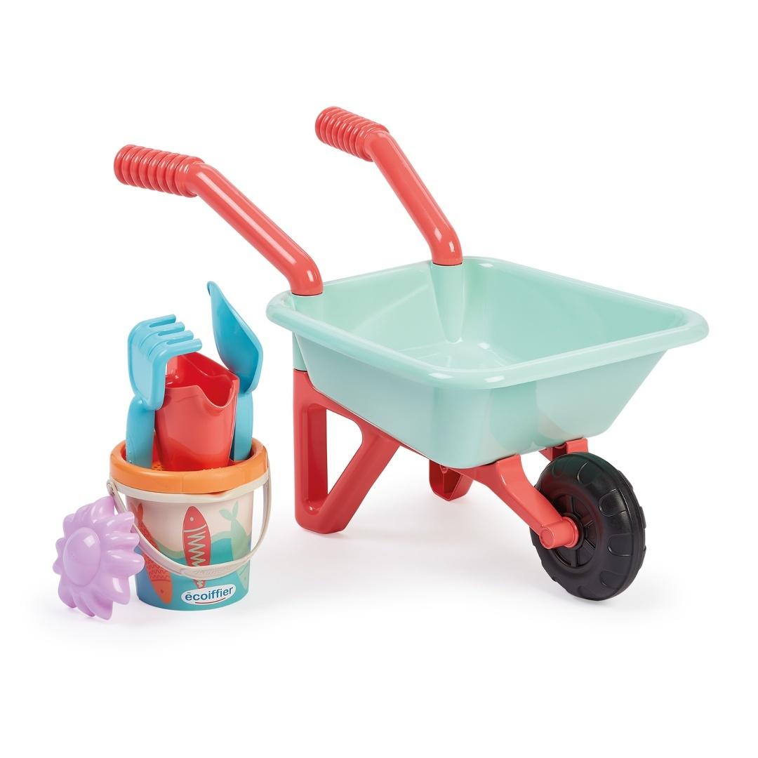 EC Taczka z akcesoriami do piasku nTaczka z 1 kółkiem, w zestawie wiaderko 12 cm, łopatka, grabki, sitko oraz foremka do piasku. Wyprodukowane we Francji. nWymiary: TBC, 18m+