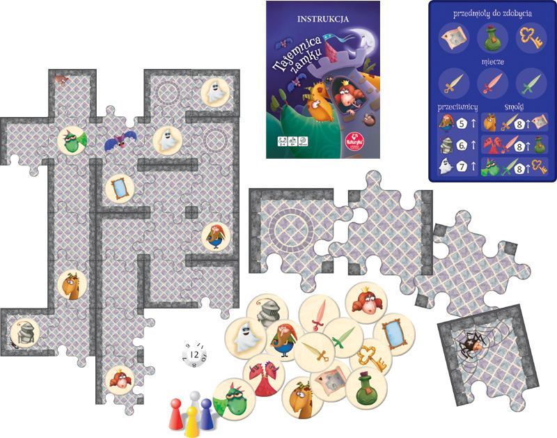 Przygodowa gra rodzinna, podczas której śmiałkowie odkrywają kolejne komnaty zamku w poszukiwaniu Księżniczki. Podczas wyprawy gracze mogą spotkać duchy, skrzaty i innych tajemniczych mieszkańców zamczyska... Zwycięzcą zostaje osoba, która jako pierwsza pokona wszystkie smoki i uwolni Księżniczkę. Gra zawiera: • 60 elementów labiryntu • 48 żetonów • 4 pionki • kostkę do gry • instrukcję Wiek graczy: 7+ Liczba graczy: 2-4 Czas rozgrywki: 45 minut