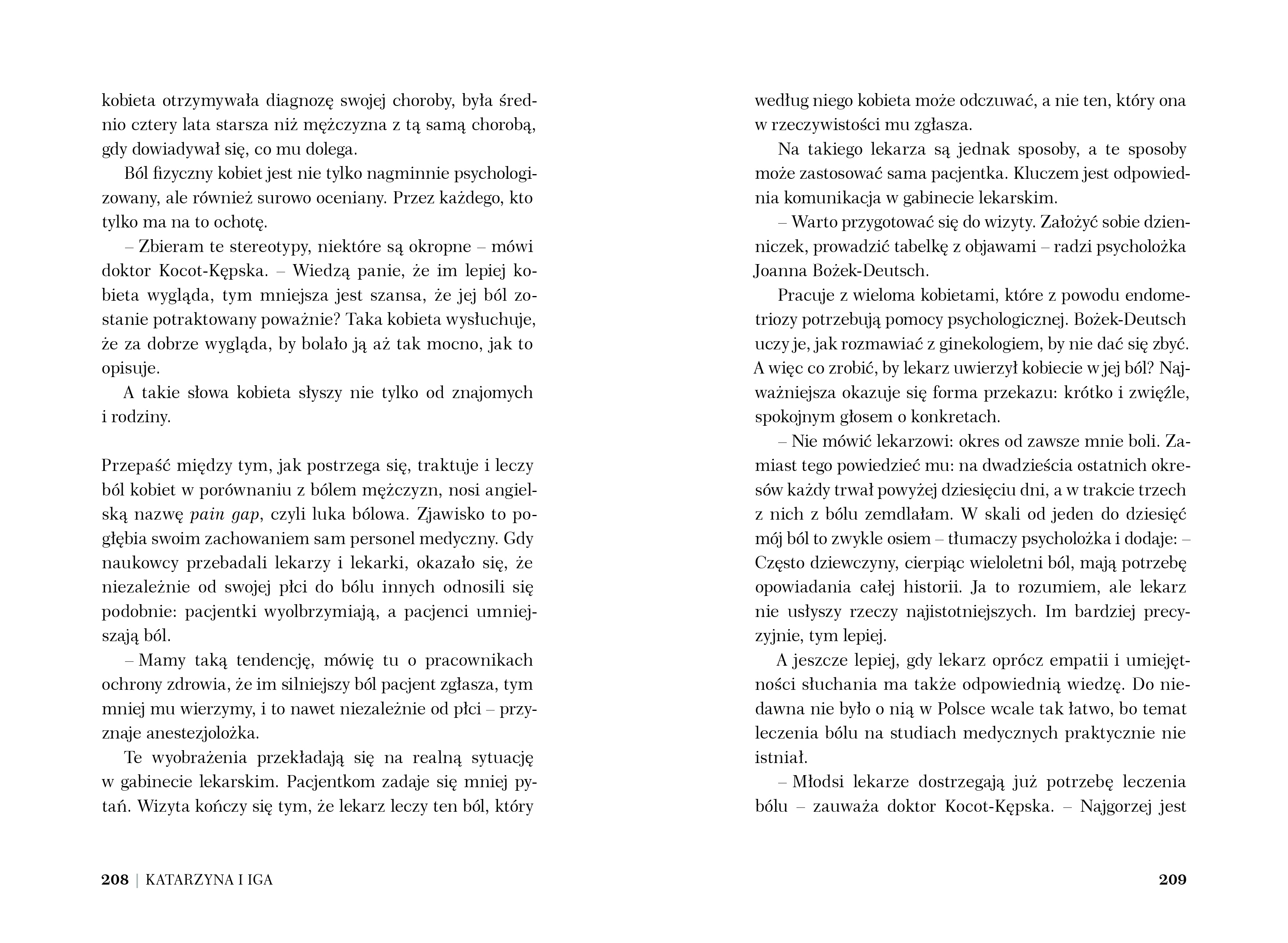 Ta książka to wzorowa reprezentacja polskich kobiet z endometriozą. Bez ogródek wyjawia trudy poszukiwań diagnozy, ukazuje zróżnicowanie poziomu polskiej ginekologii oraz prezentuje aktualną wiedzę medyczną. Przede wszystkim jednak wspiera i daje nadzieję - zarówno w chorowaniu, jak i w dążeniu do zmian systemowych. Przejmująca, prawdziwa, potrzebna.