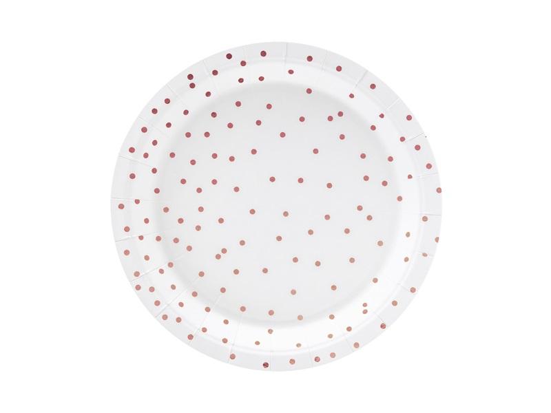 Białe talerzyki papierowe ze wzorem kropek w kolorze różowego złota, średnica ok. 18 cm.(1 op. / 6 szt.)