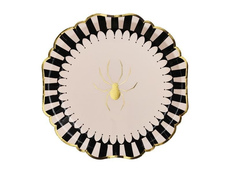 Papierowe talerzyki Halloween ze złotym, błyszczącym pająkiem. Średnica około 23 cm.(1 op. / 6 szt.)