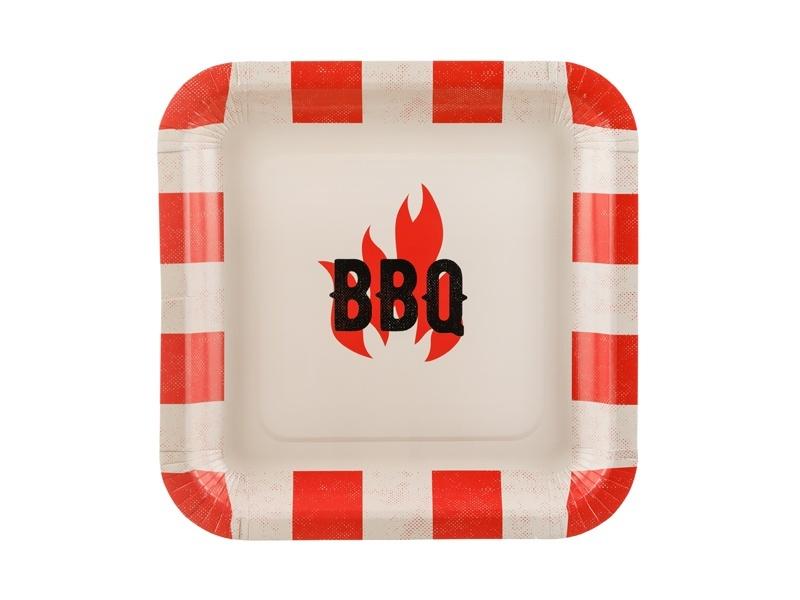 Talerzyki papierowe kwadratowe z czarnym napisem BBQ w kolorzo czerwono-kremowym. Wymiary ok. 26 x 26 cm.(1 op. / 6 szt.)