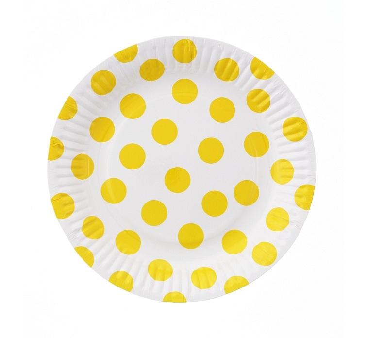 Papierowe talerzyki w kolorze białym z żółtymi groszkami.