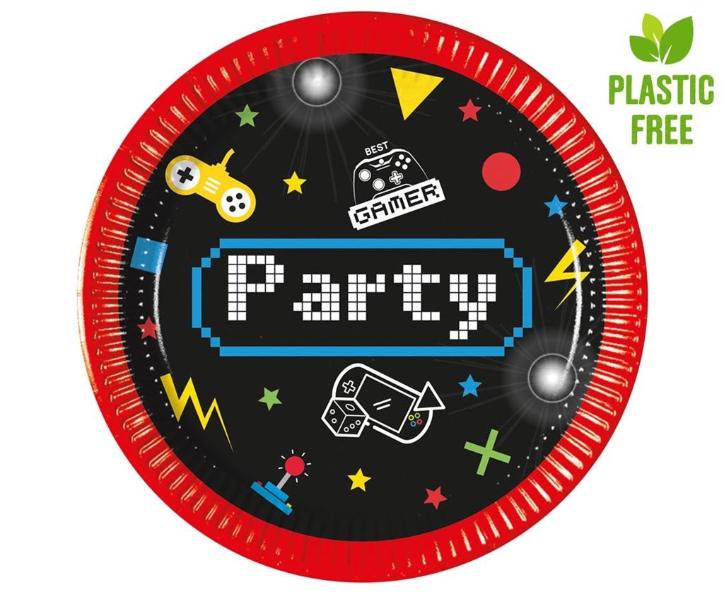 Talerzyki papierowe Gaming Party, 20cm, 8 szt. (plastic-free) Średnica: 20 cm Materiał: 100 % papier (bez plastiku) Kształt: Okrągły Kolor: Czarny Nadruk: Motywy konsoli i gier komputerowych w opakowaniu: 8 szt. Producent: PROCOS S.A. Talerzyki papierowe z nadrukiem gier komputerowych to extra dekoracja na gaming party lub urodziny gracza. Talerze gaming party wyróżniają się wysokiej jakości, atrakcyjnym nadrukiem w stylu gier. Jeśli Twoje dziecko jest fanem gier komputerowych np. Minecraft, Battle Royal lub Mario, to będzie zachwycone urodzinami w stylu gier komputerowych. Talerze papierowe są odpowiednie zarówno do ciepłych, jak i zimnych dań. Wysokiej jakości nadruk przyciąga wzrok i wyróżnia się wśród zastawy stołowej. Talerzyki papierowe gaming party to must-have na każde LAN party z przyjaciółmi! Talerzyki powstały w 100% z papieru. Nie zawierają ani grama plastiku. Jedz i imprezuj w zgodzie z Naturą.