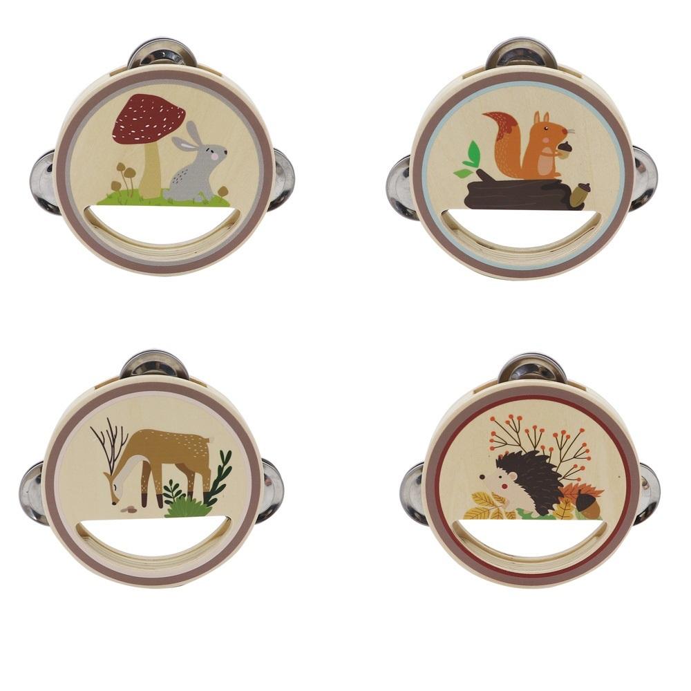 Tamburyn drewniany 4 wzory - jeż, zając, wiewiórka, jeleń Wielkość instrumentu 12.5 x 2 cm wymiary display'a: 23 x 23 x 5(12) cm Wiek: 3+