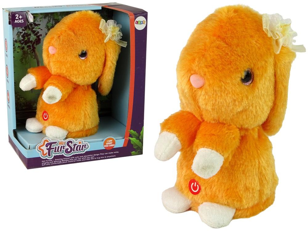 Tańczący Królik Powtarzający Dźwięki Muzyka Pomarańczowy Ten uroczy króliczek to doskonały towarzysz zabaw dla dzieci. Ma wymiary 20 cm x 13 cm x 10 cm i jest wyjątkowo przyjazny. Jego długie uszy, urocze różowe oczka i ozdobny tiulowy kwiat na głowie nadają mu niezwykły urok. Króliczek jest zabawką interaktywną, która działa dzięki 3 bateriom 1.5V AAA (brak w zestawie). Po włożeniu baterii, włączeniu go przesuwnym przyciskiem i włączeniu z przodu, zaczyna grać radosną melodyjkę i tańczyć lub powtarzać dźwięki, które usłyszy od ciebie. To prawdziwie zabawny sposób na dostarczenie rozrywki i śmiechu maluchowi. Wymiary opakowania wynoszą 23 cm x 19 cm x 12 cm, co sprawia, że jest to idealny prezent dla dzieci. Ten tańczący królik nie tylko bawi, ale także rozwija zdolności słuchowe i sprawia, że każdy dzień staje się pełen uśmiechu i muzyki. Wymiary króliczka: 20 cm x 13 cm x 10 cm Wymiary opakowania: 23 cm x 19 cm x 12 cm Posiada certyfikat CE, ponadto jest zgodny z normą EN71. Zabawka przeznaczona jest dla dzieci powyżej 24. miesiąca życia.