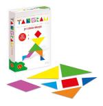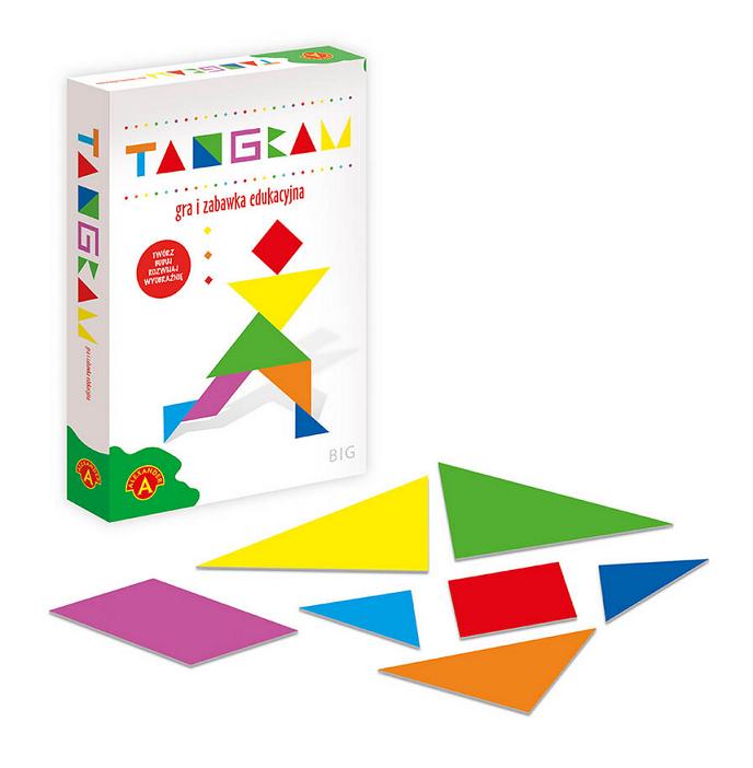 Tangram to chińska łamigłówka znana od ok. 3000 lat. Składa się z siedmiu elementów w postaci figur geometrycznych (tan), powstałych przez rozcięcie kwadratu. Celem łamigłówki jest odtworzenie położenia wszystkich siedmiu elementów tangramu w przedstawionym obrazku na podstawie jedynie kształtu jego konturów, a także wymyślenie własnych wzorów. Proponujemy Tangram nie tylko w wersji zabawki, ale także jako emocjonującą grę w 3 wariantach. Gry Tangram to świetne ćwiczenie wyobraźni, spostrzegawczości, koncentracji i pamięci. Zawartość pudełka: 12 dużych trójkątów prostokątnych, 6 średnich trójkątów prostokątnych, 12 małych trójkątów prostokątnych, 6 kwadratów, 6 równoległoboków, 60 żetonów, instrukcja.