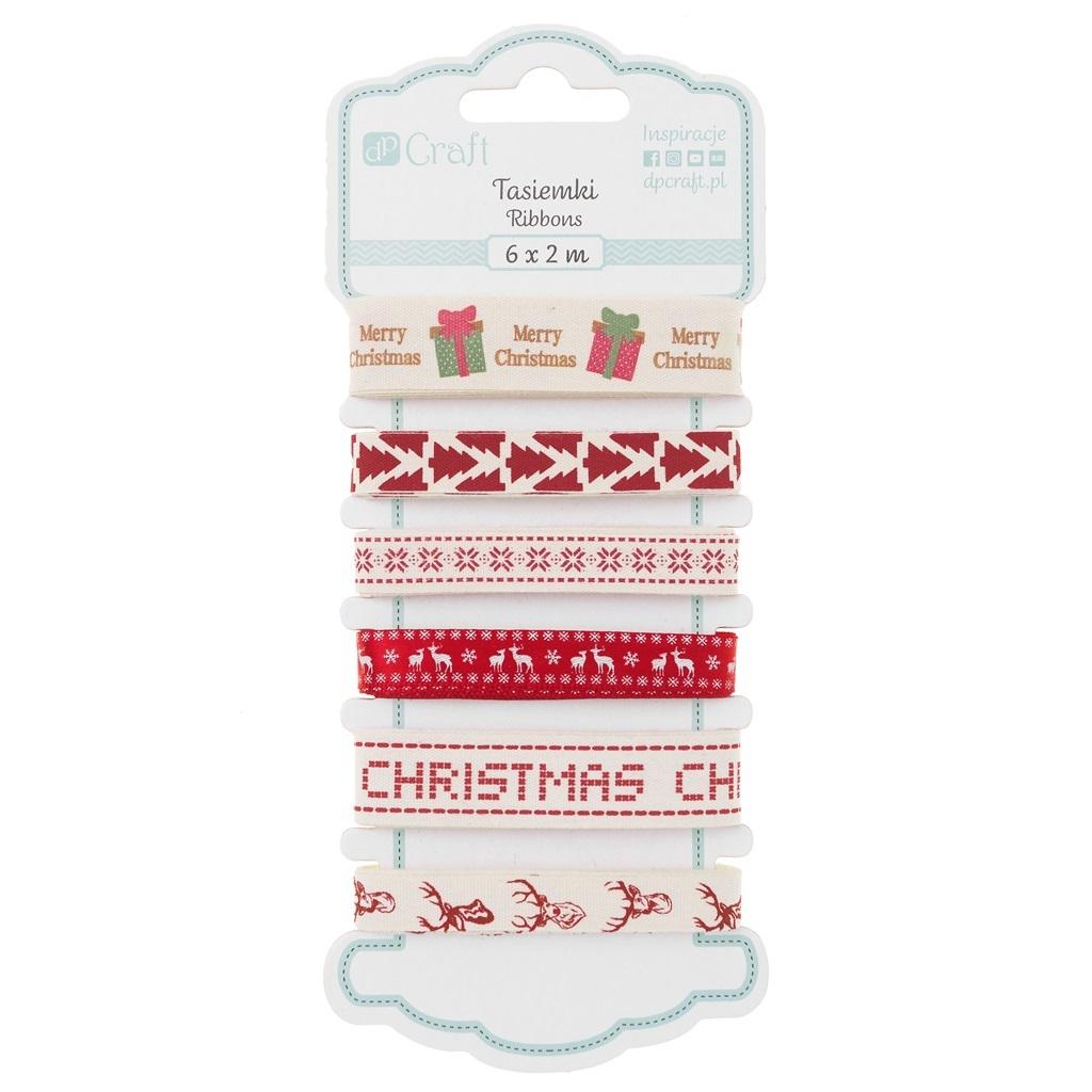 Zestaw bawełnianych tasiemek w kremowo-czerwonych kolorach z motywami reniferów, choinek, prezentów, świątecznych napisów i ozdobnych wzorów. Tasiemki Scandi Christamas będą prezentować się pięknie przy projektach w stylu skandynawskim, vintage, eko i