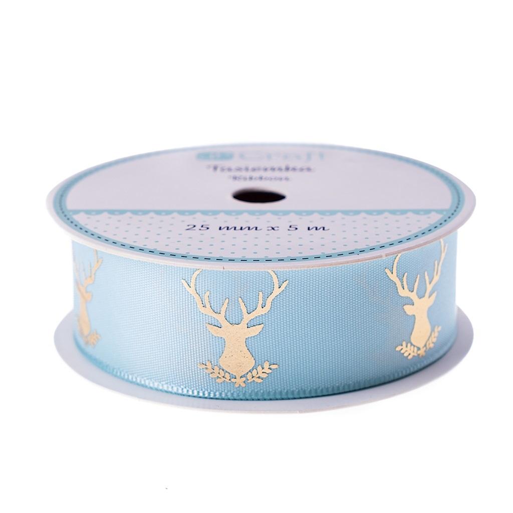 Satynowa tasiemka dekoracyjna w kolorze miętowym ze złotym motywem głowy jelenia.