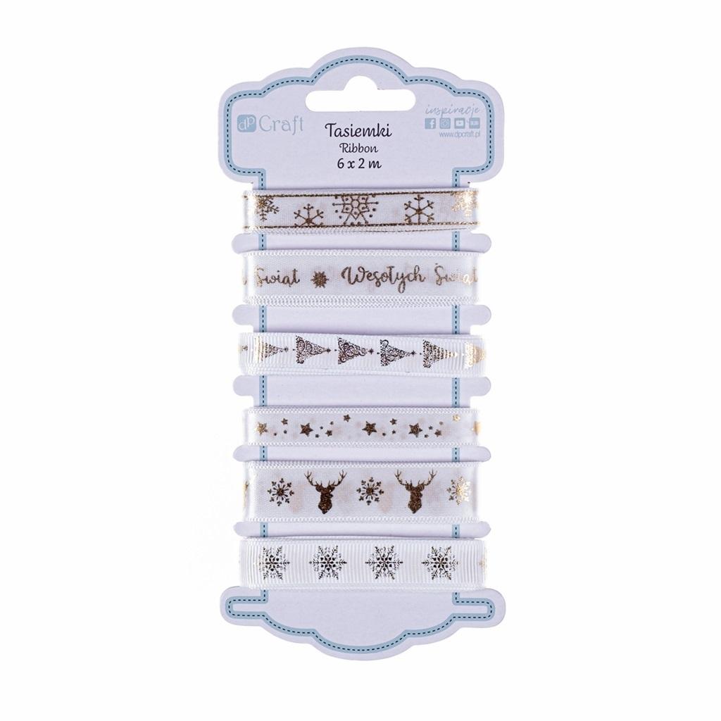 Elegancki zestaw satynowych i rypsowych tasiemek w modnym stylu White Christmas.Białe tasiemkli ze złotymi motywami śnieżynek, gwiazdek, reniferów, choinek i napisem "Wesołych Świąt" idealnie wpisują się w panujące trendy.