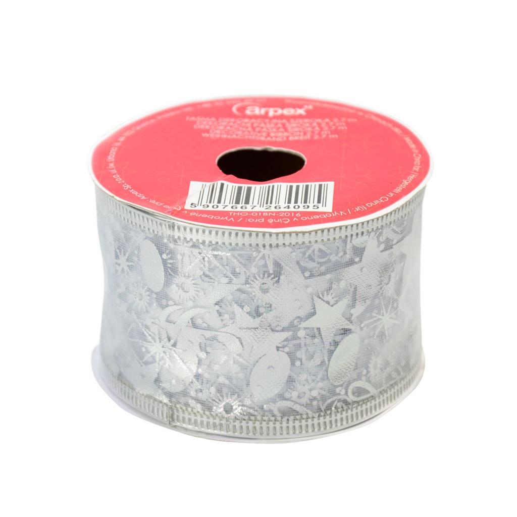 Taśma dekoracyjna na szpuli szeroka srebrna. Element dekoracyjny o wymiarze: 5x270 cm.