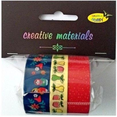 Taśmy samoprzylepne papierowe WASHI 3 szt. miks wzorów. . Zestaw 3 ozdobnych taśm samoprzylepnych wykonanych z mocnego japońskiego papieru długości 5 mb. Taśmy dają się odkleić od podłoża bez niszczenia go.