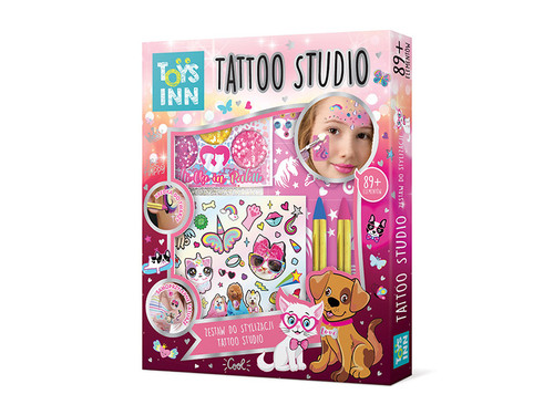 W zestawie: 2 kredki do malowania twarzy, paletka z brokatem w 3 kolorach, samoprzylepne kryształki, 1 arkusz szablonów, 1 arkusz kolorowych tatuaży Wiek: 5+